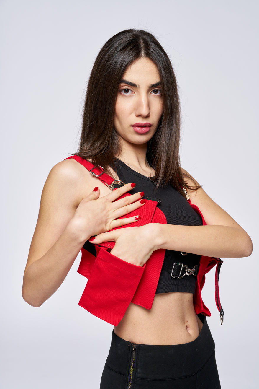 The Empress Vest is not merely an item of clothing but a narrative of regal allure. Draped in the resplendence of scarlet red, this vest commands attention with its sculpted fit that celebrates the contours of power. The shoulders are adorned with metallic epaulettes, each etched with the SangNova logo, signifying the wearer's allegiance to a brand that epitomizes luxury. As the fabric hugs the waist, the silver-toned buckles and clasps whisper tales of old-world craftsmanship reimagined for the modern sovereign who walks the path of both the bold and the beautiful.