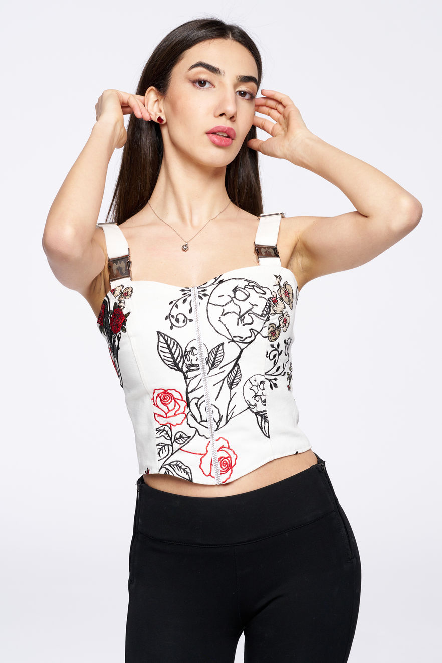 Clad in ethereal white denim, it is a bastion of avant-garde luxury, with the SangNova insignia upon the shoulder metalwork acting as a sigil of distinction. The embroidery, a contrast of skulls and blooming roses, weaves a story of power intertwined with passion. As it cinches the waist, the Regent Corset doesn't just transform a figure; it transforms an aura, draping the wearer in a cloak of mystique and majesty befitting the annals of SangNova's pioneering chronicles.